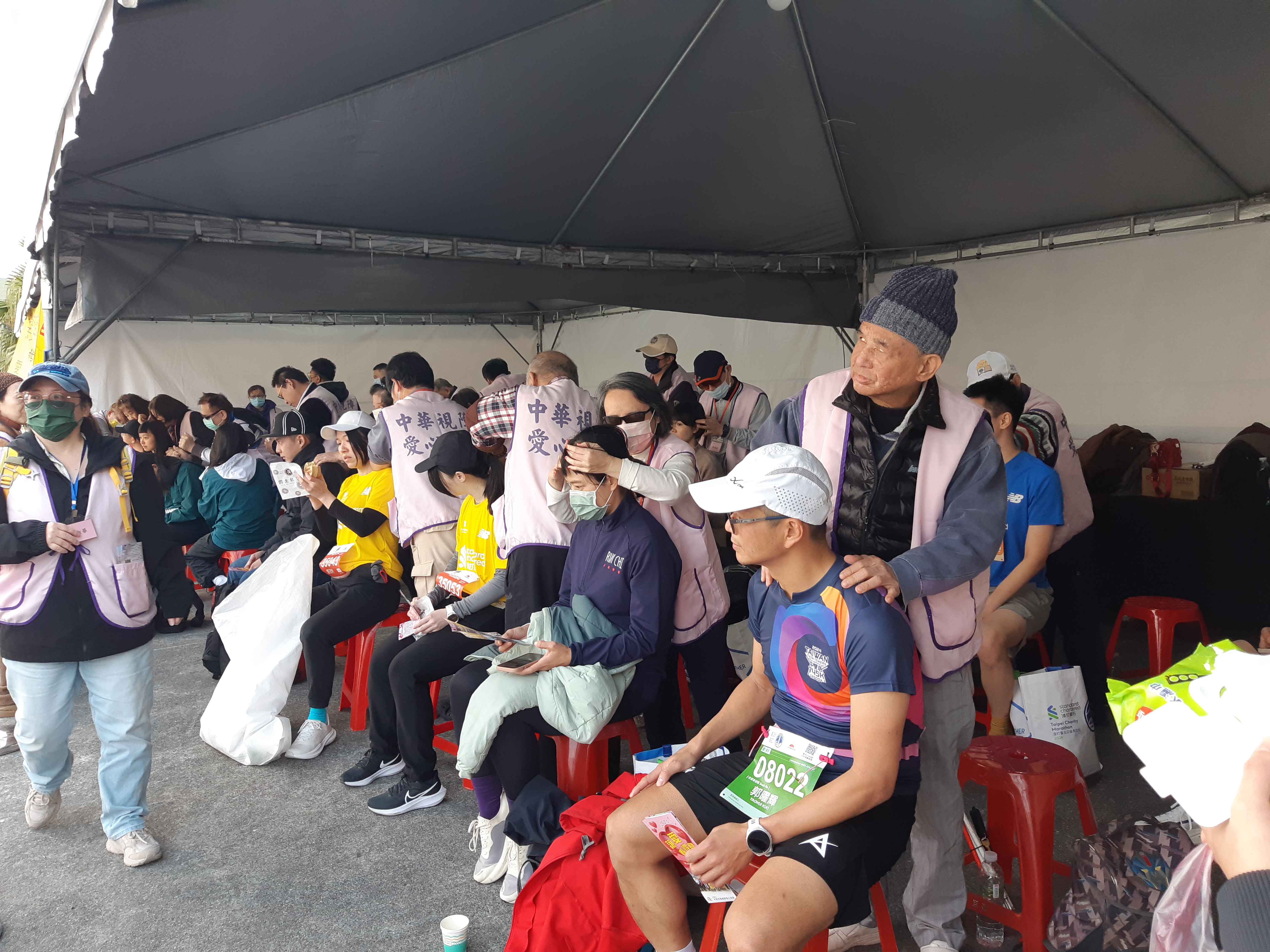 所有視障按摩師使出渾身解數,為路跑選手抓龍舒緩肩頸痠痛。