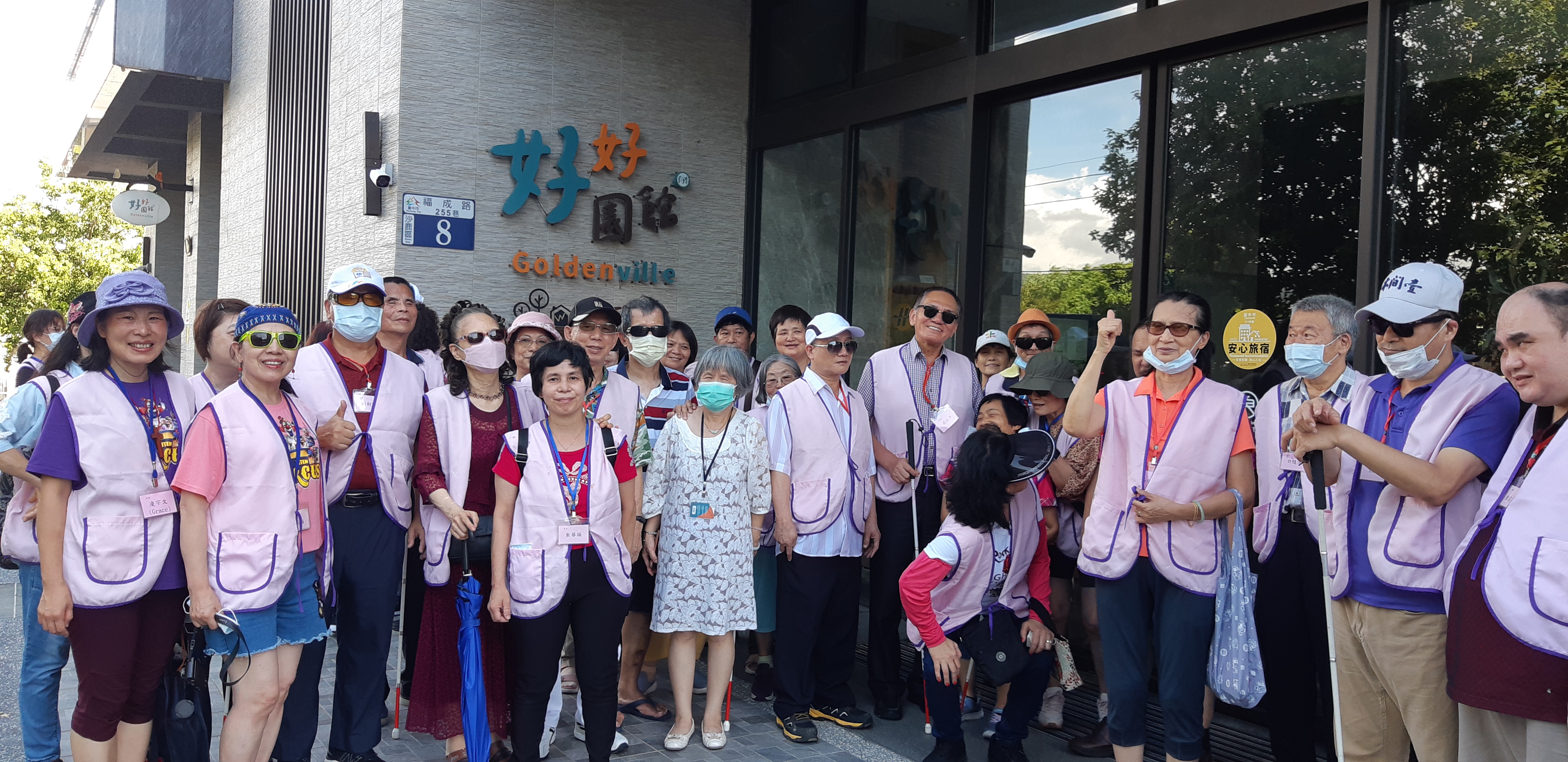 盲人愛心行善團於聽完簡報後,全體參加成員於好好園館大門口合影留念。