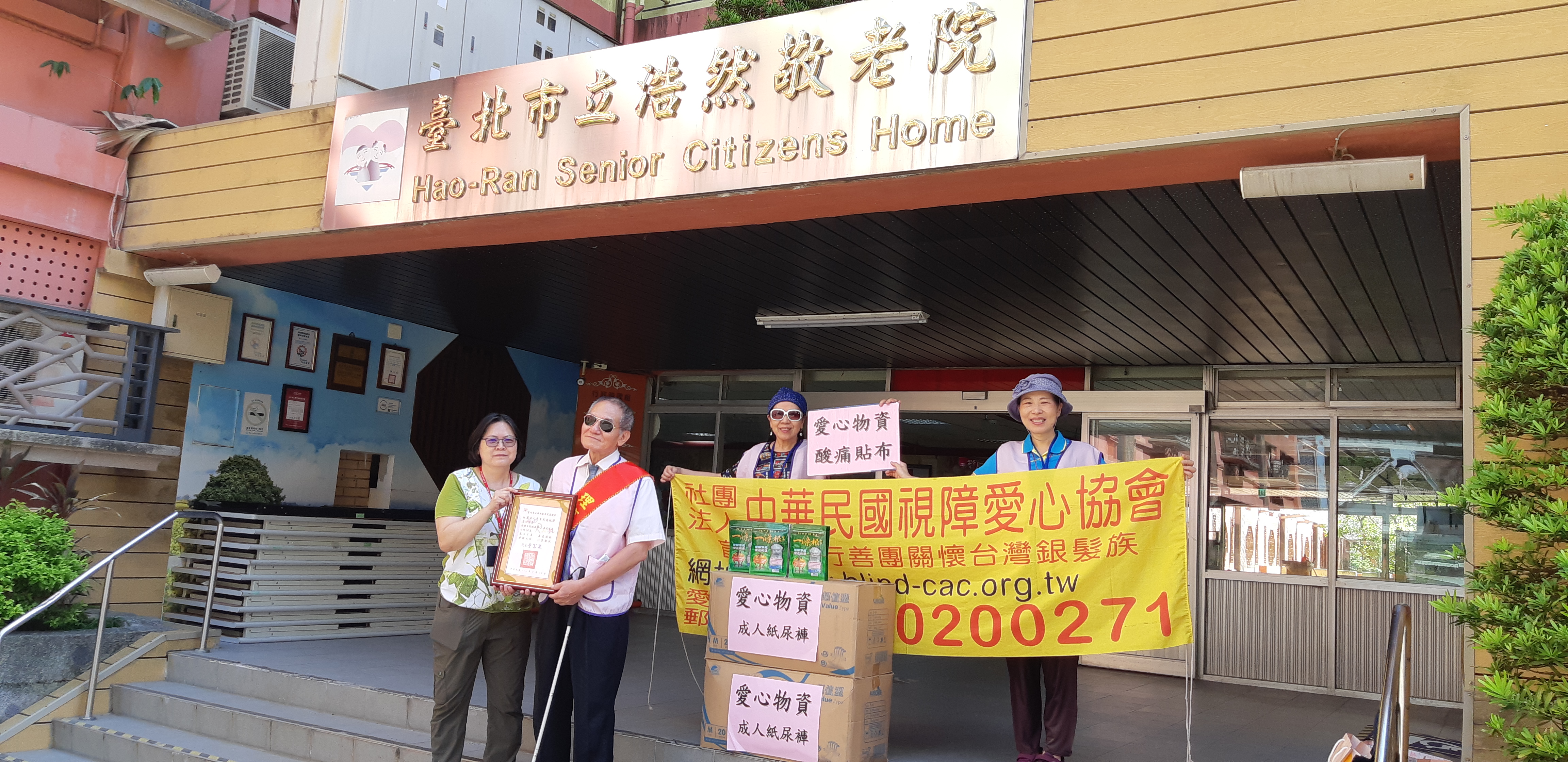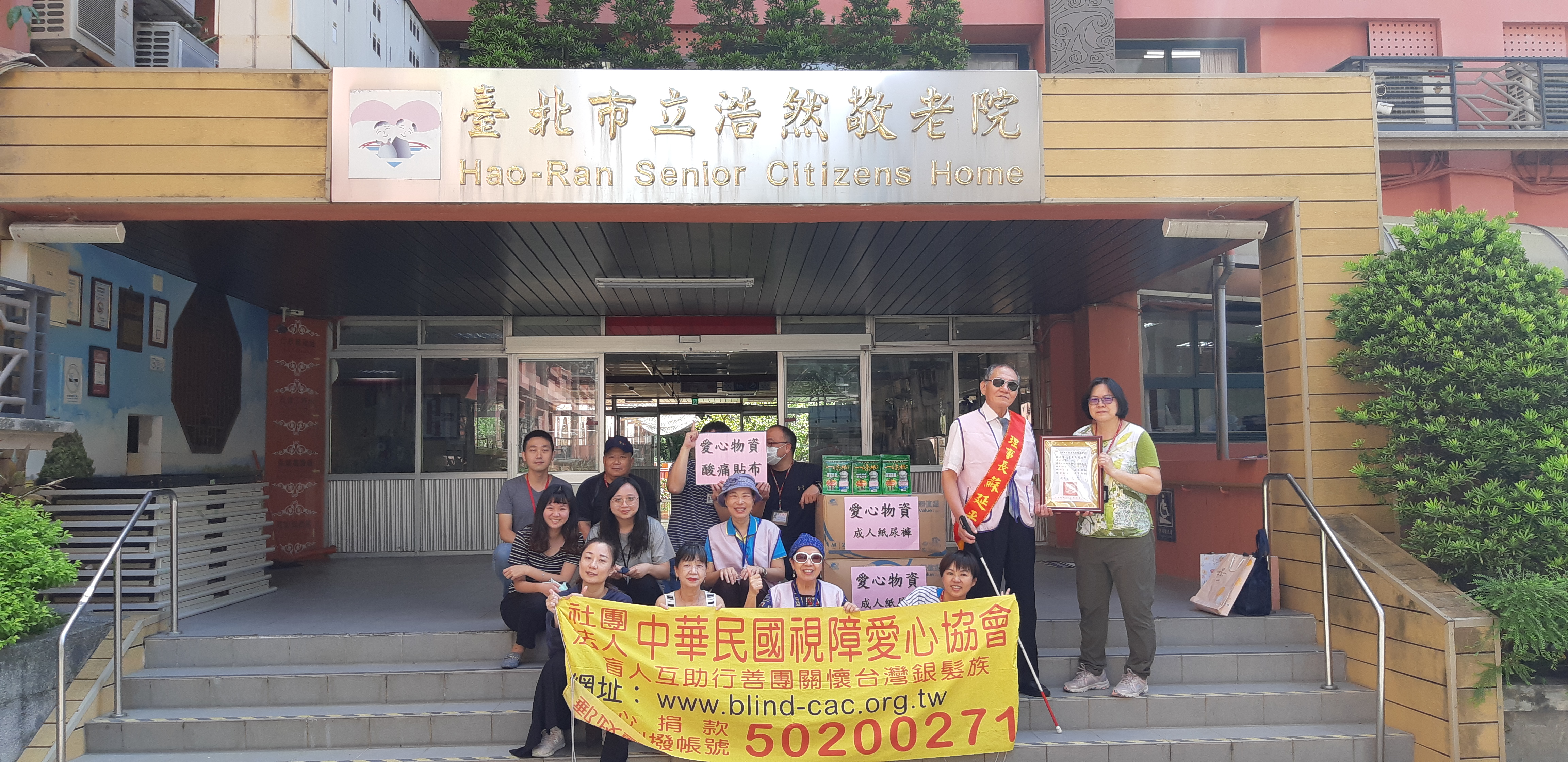 孫秀雲秘書特頒贈感謝狀給蘇理事長,我們也於浩然敬老院大門口與院內工作同仁合影留念